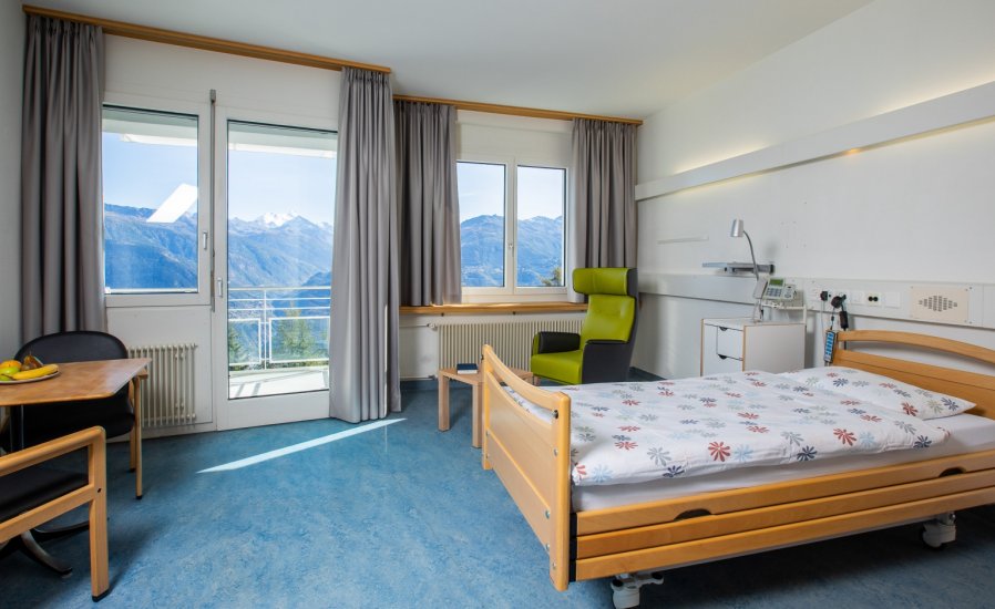 Ein Blick aus dem Fenster wie eine Postkartenansicht? Das bieten Ihnen die Einzel- und Zweibettzimmer unserer Klinik, die gegen Süden ausgerichtet sind. Die Zimmer mit angenehmer Wohlfühlatmosphäre verfügen über einen eigenen Balkon und geben den Blick frei in die Walliser Alpenwelt.